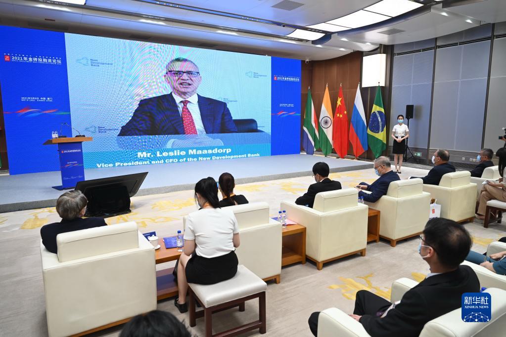 9月9日,金磚國家新開發(fā)銀行副行長兼首席財(cái)務(wù)官馬磊立在2021年金磚投融資論壇上通過視頻發(fā)言。新華社記者 林善傳 攝