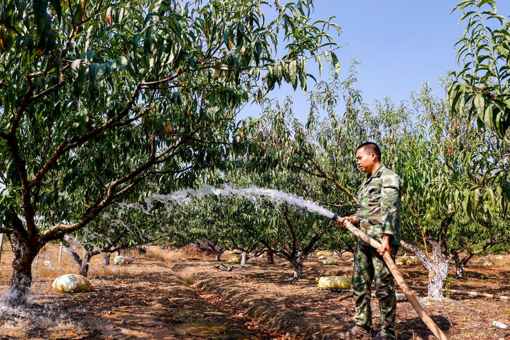9月11日,江西省吉安市峽江縣金坪民族鄉(xiāng)新民民族村村民鄭馨貴在給桃樹(shù)澆水。陳福平攝