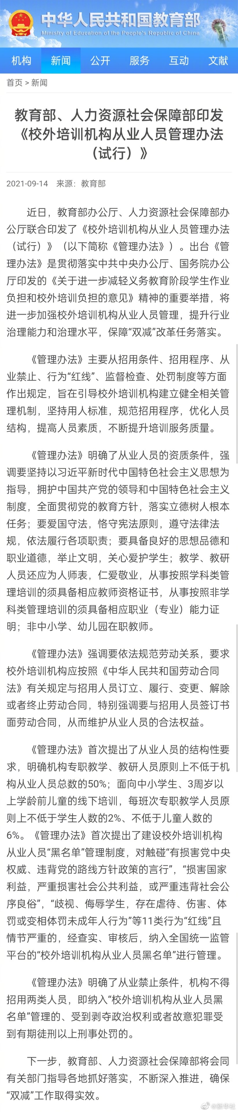 兩部門印發(fā)《校外培訓(xùn)機(jī)構(gòu)從業(yè)人員管理辦法(試行)》