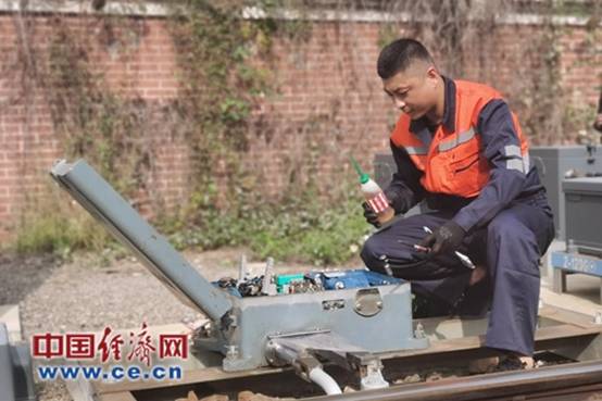 電務(wù)人員維修道岔轉(zhuǎn)轍機(jī)。中國(guó)經(jīng)濟(jì)網(wǎng)記者佟明彪/攝