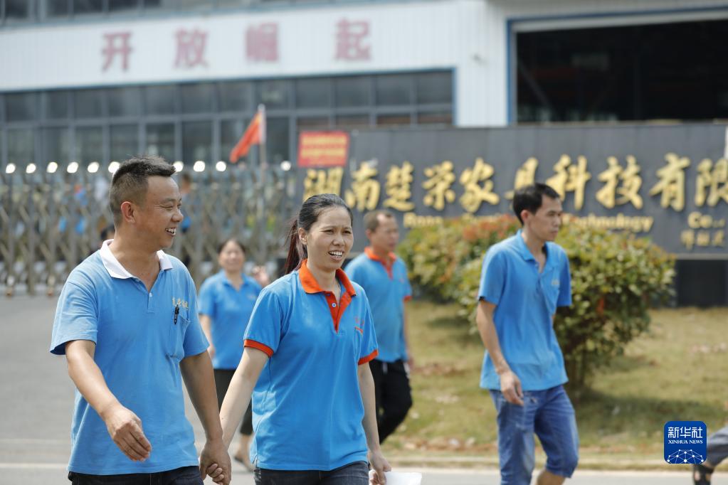 9月17日,陳輝(左一)和妻子中午下班后走在湖南廣東(桂陽(yáng))家居智造產(chǎn)業(yè)園里!⌒氯A社發(fā)(戴奇成 攝)