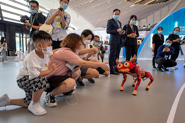 9月26日,在“互聯(lián)網(wǎng)之光”博覽會(huì)上,憨態(tài)可掬的機(jī)器牛吸引著許多參觀者的目光。人民網(wǎng)記者 翁奇羽攝