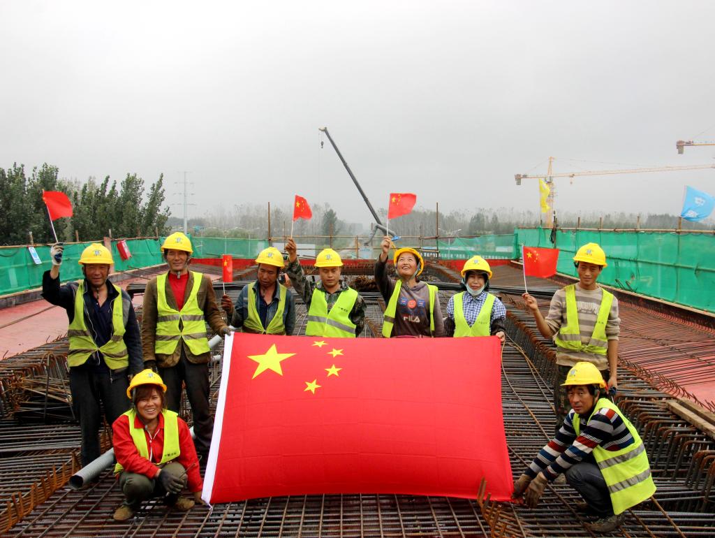 10月1日,在中建八局鄭濟(jì)高鐵二標(biāo)段施工現(xiàn)場,工人慶祝國慶節(jié)。新華社記者 范長國 攝