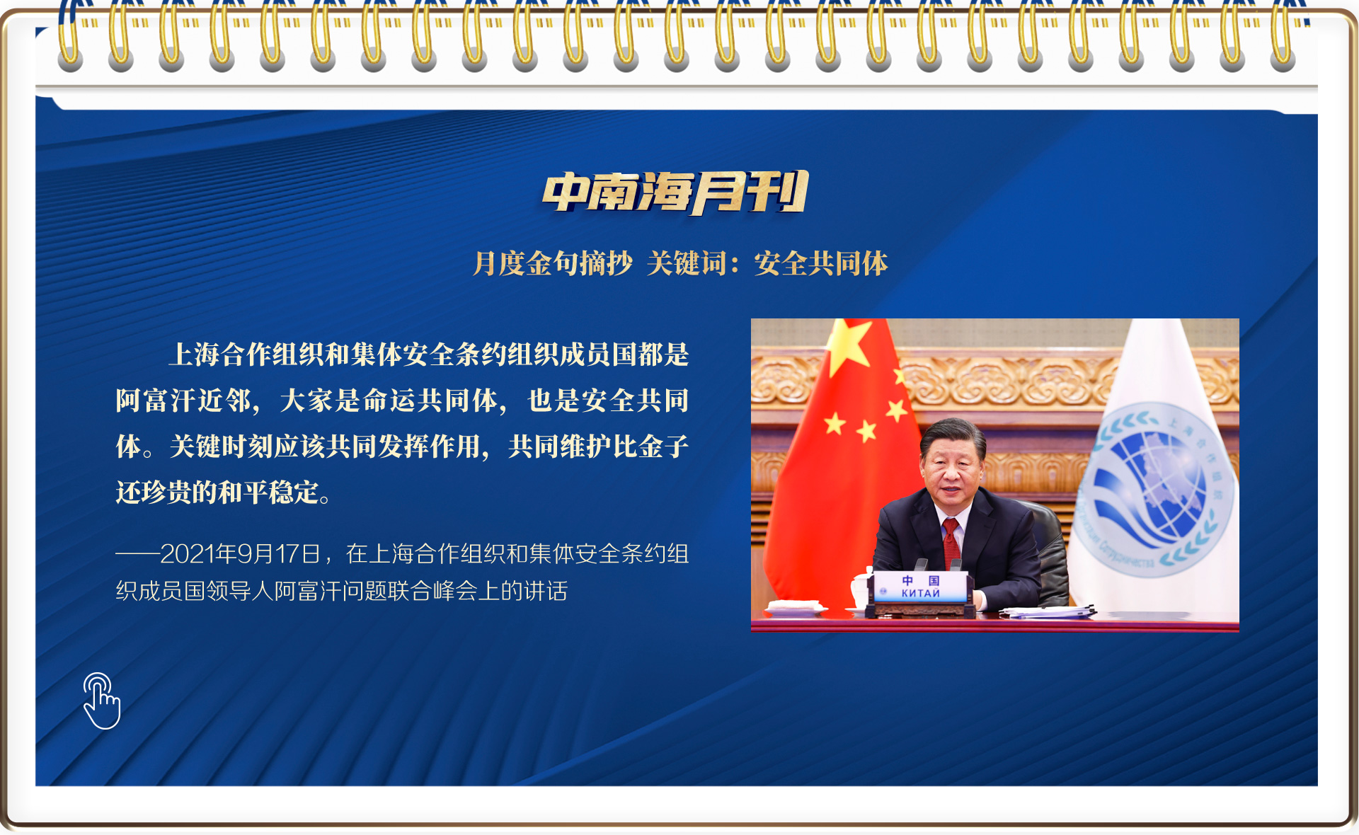 高頻詞中,“安全”一詞也位于前列。9月17日,習近平主席在北京以視頻方式出席上海合作組織和集體安全條約組織成員國領(lǐng)導人阿富汗問題聯(lián)合峰會。習主席在峰會上以生動比喻對安全問題表明立場:上海合作組織和集體安全條約組織成員國都是阿富汗近鄰,大家是命運共同體,也是安全共同體。關(guān)鍵時刻應該共同發(fā)揮作用,共同維護比金子還珍貴的和平穩(wěn)定。