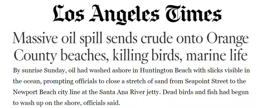 1990年,加州南部海岸發(fā)生油輪泄漏事故,41.7萬(wàn)加侖原油流入海中,導(dǎo)致奧蘭治縣沿岸大量魚(yú)類和約3400只海鳥(niǎo)死亡;