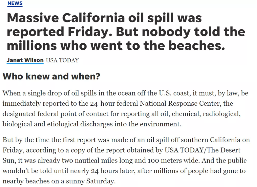 據(jù)《今日美國(guó)報(bào)》報(bào)道,加州州長(zhǎng)緊急服務(wù)辦公室在當(dāng)?shù)貢r(shí)間1日傍晚6點(diǎn)左右就收到原油泄漏的相關(guān)消息,然而,有關(guān)部門(mén)卻隱瞞了這一消息近24個(gè)小時(shí)后才向民眾公開(kāi)。而發(fā)生泄漏事故的涉事石油公司第二天才通報(bào)管道泄漏的消息。這導(dǎo)致成千上萬(wàn)名當(dāng)?shù)鼐用窈陀慰?日前往被污染的海灘時(shí),生命健康遭受嚴(yán)重威脅。