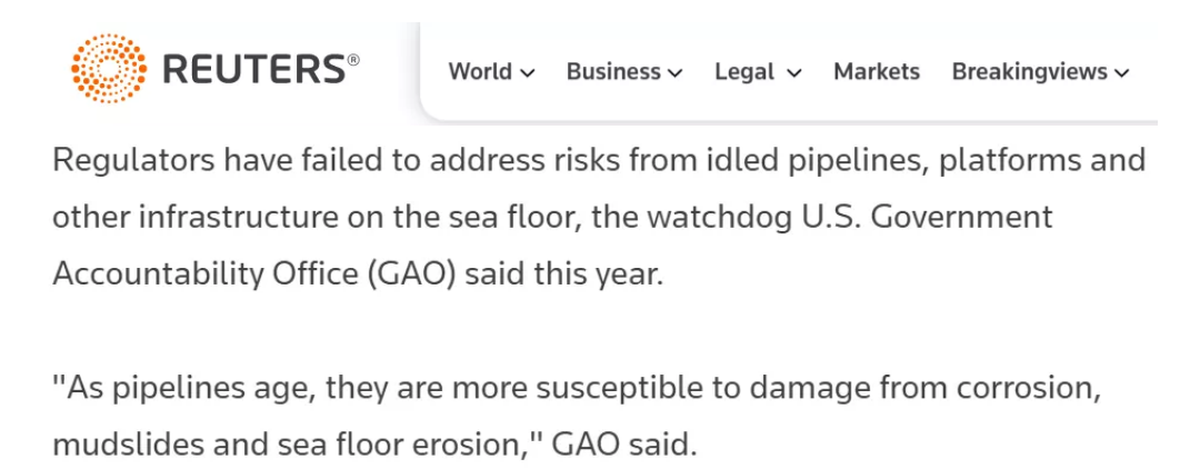 美國(guó)生物多樣性中心海洋分部主任梅月卡·阪下分析說(shuō),此次事故很可能是相關(guān)基礎(chǔ)設(shè)施老化引起的,顯而易見(jiàn),相關(guān)部門(mén)沒(méi)有盡到監(jiān)管的責(zé)任。