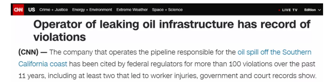 2015年,圣巴巴拉海岸以北一條輸油管道破裂,承擔(dān)事故責(zé)任的公司最初估計(jì)泄漏量為2.1萬(wàn)加侖,但后來(lái)將其修改為超過(guò)14萬(wàn)加侖,并且該公司事后承認(rèn)在發(fā)現(xiàn)泄漏三個(gè)多小時(shí)后才通知聯(lián)邦監(jiān)管機(jī)構(gòu)……