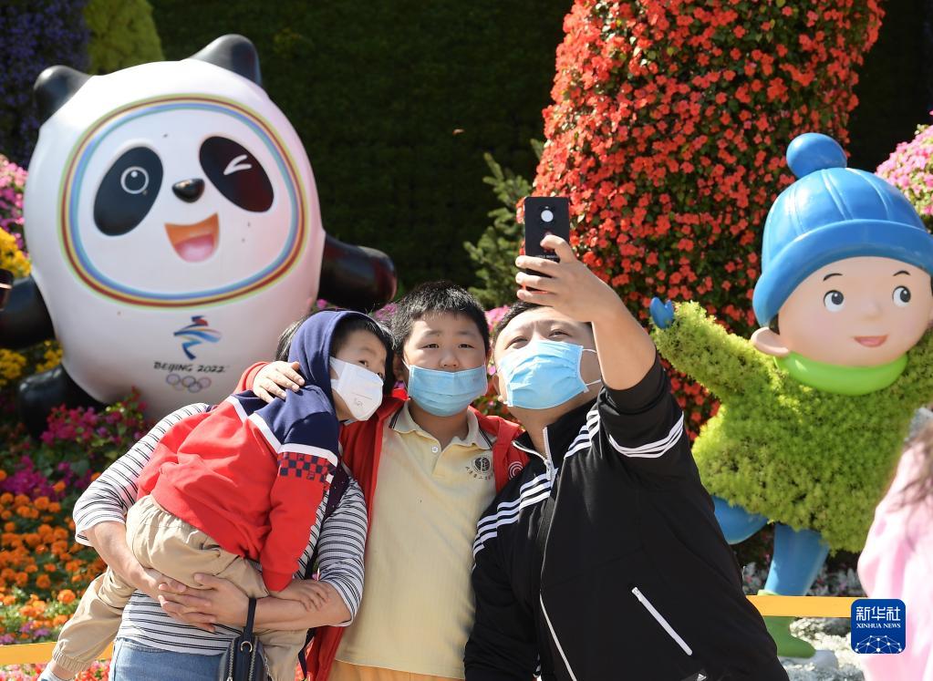 10月1日,人們?cè)诒本╅L(zhǎng)安街西單路口“喜迎冬奧”主題花壇前拍照留影。