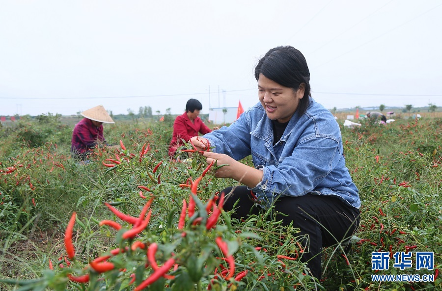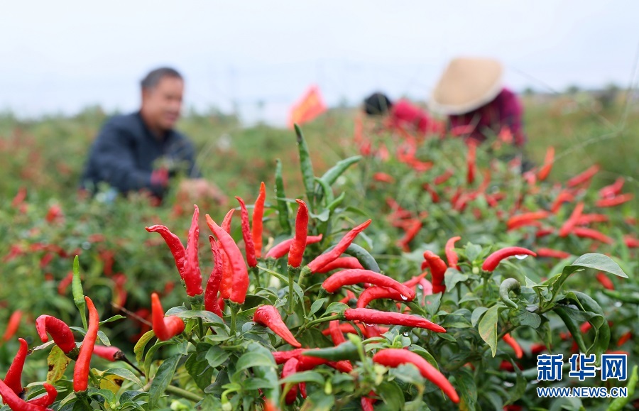 10月5日,河南省洛陽市汝陽縣蔡店鄉(xiāng)孟腦村千畝辣椒種植基地,村民在搶收辣椒。