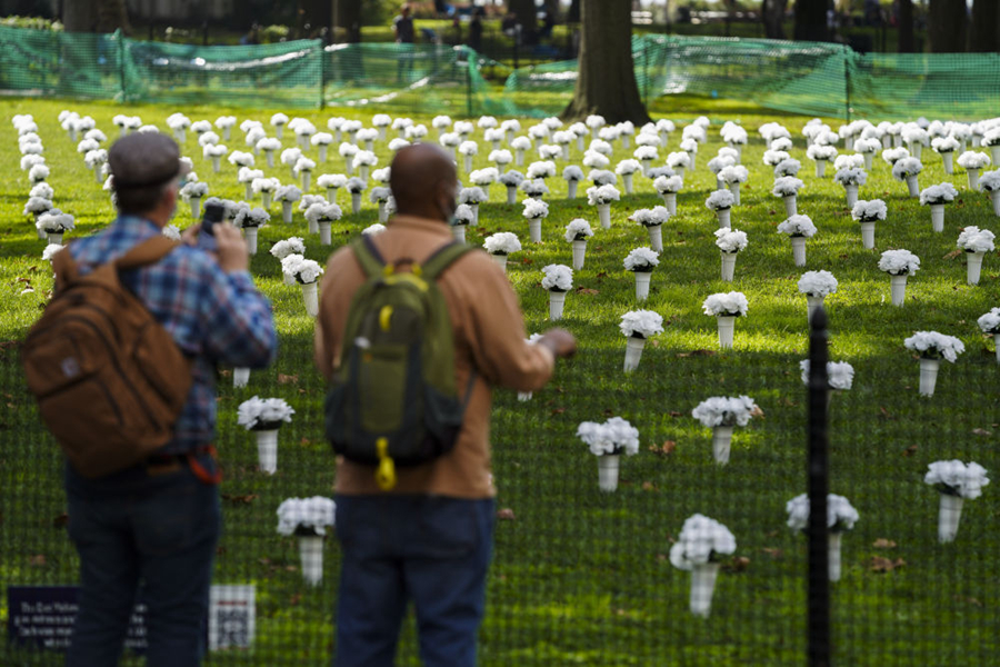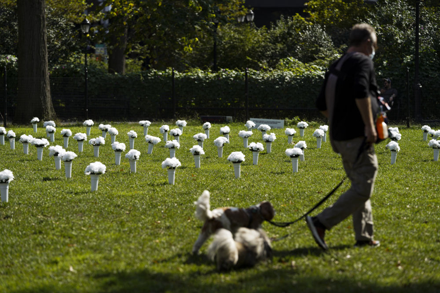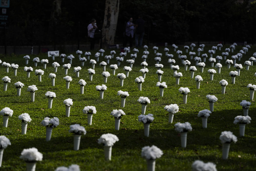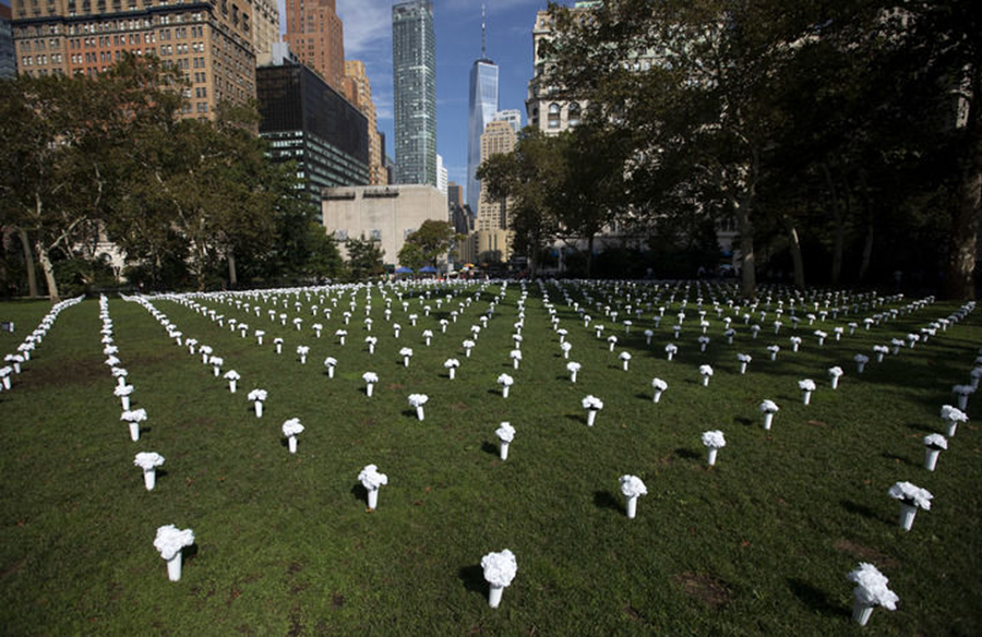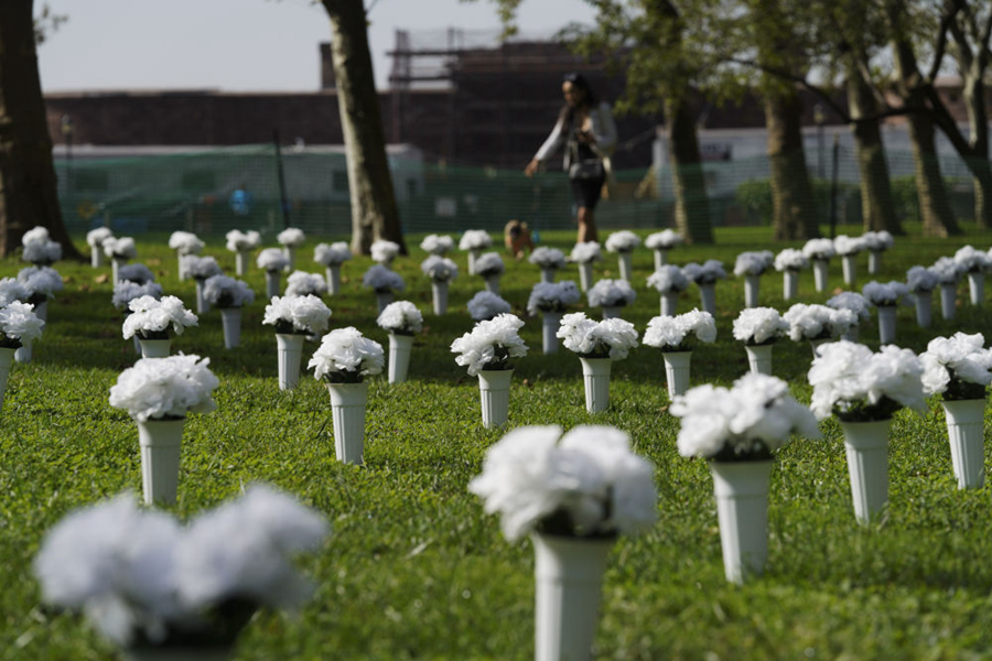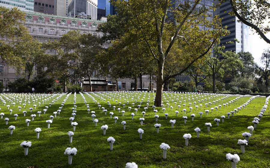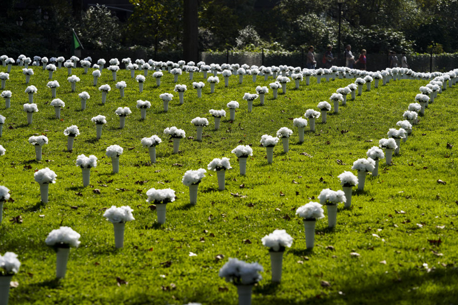 10月8日,在美國紐約炮臺(tái)公園,1050個(gè)白色瓶花組成大型紀(jì)念裝置,悼念2020年在紐約州死于槍支暴力的1050名受害者,呼吁政府針對(duì)槍支暴力采取行動(dòng)。