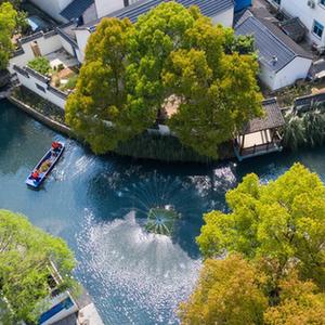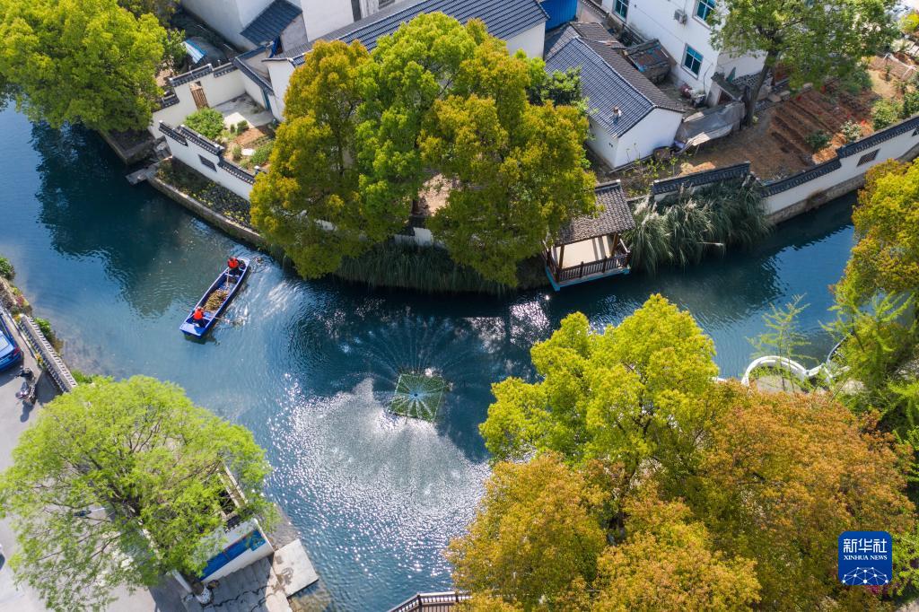 在浙江省長(zhǎng)興縣龍山街道渚山村,保潔人員進(jìn)行日常河道護(hù)理巡查(2020年4月9日攝,無人機(jī)照片)。新華社記者 徐昱 攝