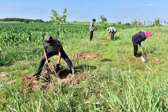 《黃河保護法(草案)》突出加強生態(tài)保護與修復。圖為林草工人正在科爾沁沙地里種植樹木。攝影/章軻