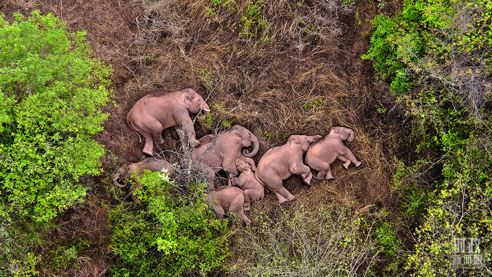 △2021年6月7日,云南省森林消防總隊(duì)的無(wú)人機(jī)監(jiān)測(cè)人員觀測(cè)到野象群暫停遷徙的一幕。這是監(jiān)測(cè)野象12天來(lái),第一次發(fā)現(xiàn)象群集體躺著睡覺(jué)。(圖/視覺(jué)中國(guó))
