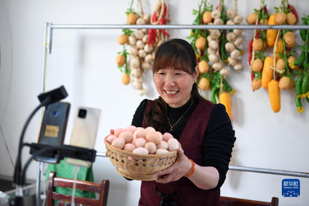 在安徽省六安市舒城縣南港鎮(zhèn)公義村錢(qián)元玲的家庭農(nóng)場(chǎng),錢(qián)元玲在直播間售賣(mài)土雞蛋(2021年3月4日攝)。新華社記者 黃博涵 攝