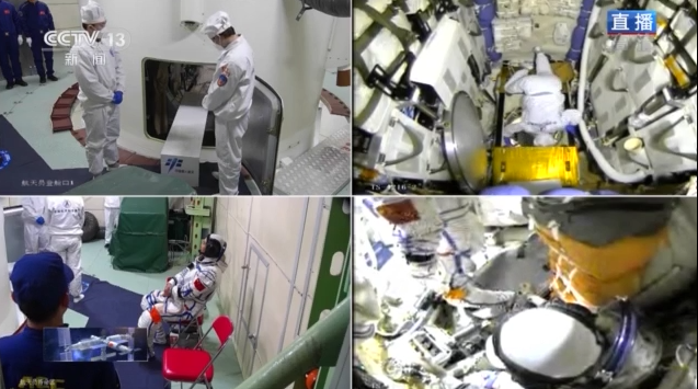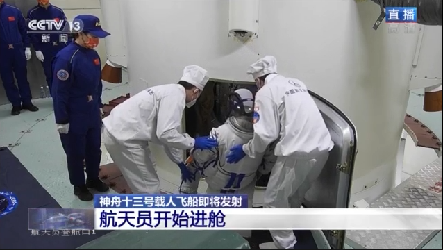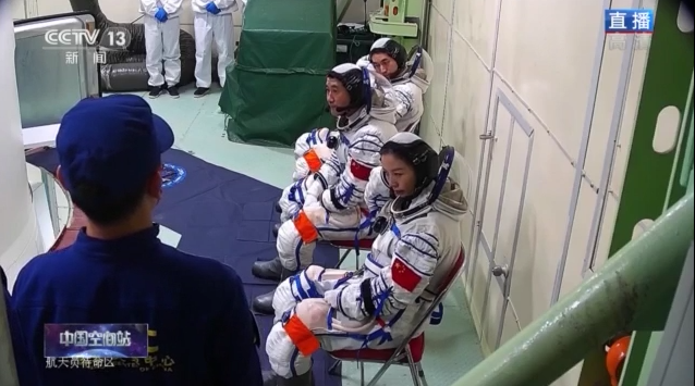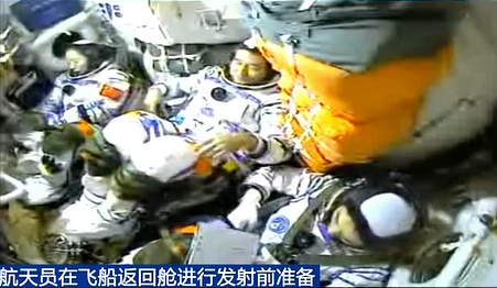 3名航天員陸續(xù)通過飛船軌道艙進入返回艙。