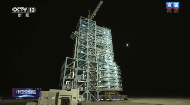 發(fā)射塔架頂部的第四組回轉(zhuǎn)平臺已打開,露出火箭逃逸塔。
