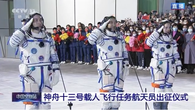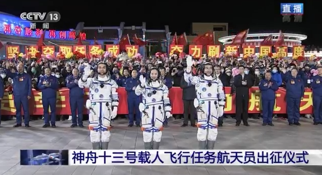 神舟十三號載人飛行任務(wù)航天員乘組出征儀式,在酒泉衛(wèi)星發(fā)射中心問天閣廣場舉行。