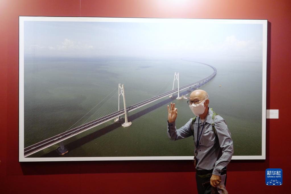 在香港中央圖書館,觀展市民和港珠澳大橋的航拍照片合影(10月15日攝)。新華社記者 王申 攝