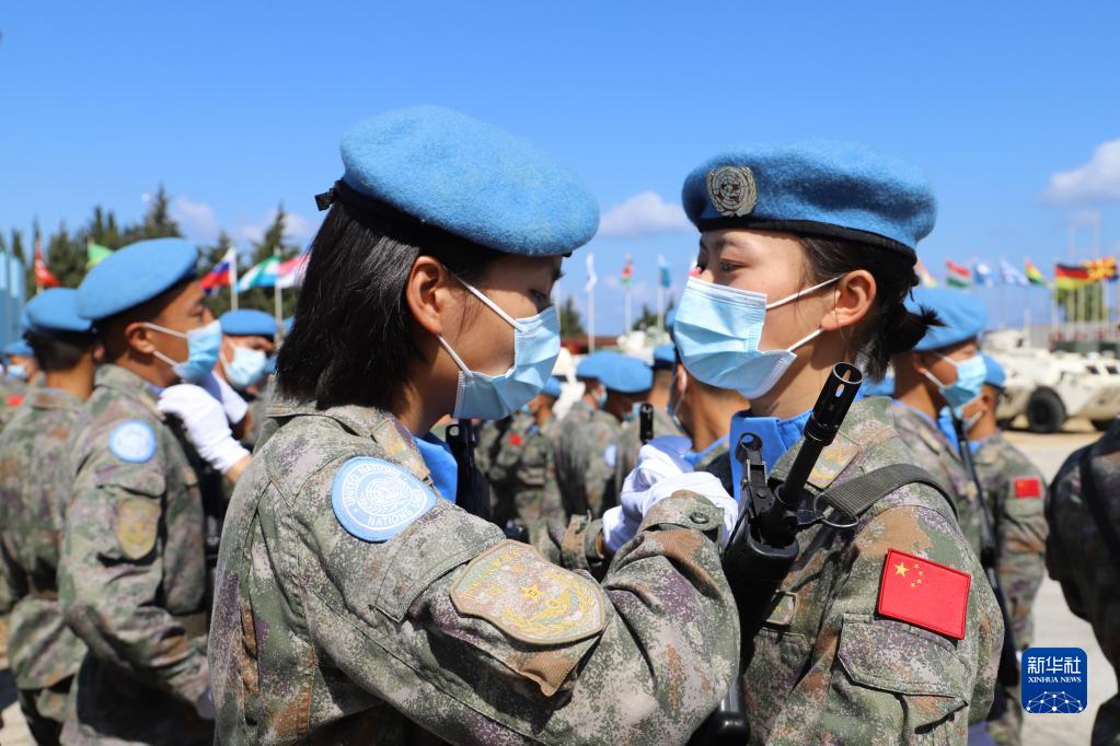 2021年6月16日,在黎巴嫩南部辛尼亞村中國(guó)維和營(yíng)舉行的授勛儀式上,接受檢閱的維和女兵進(jìn)場(chǎng)前互相整理著裝。中國(guó)第19批赴黎巴嫩維和部隊(duì)授勛儀式16日上午在黎巴嫩南部辛尼亞村的中國(guó)維和營(yíng)舉行,410名官兵全部被授予聯(lián)合國(guó)和平勛章。新華社發(fā)(劉雄馬攝)