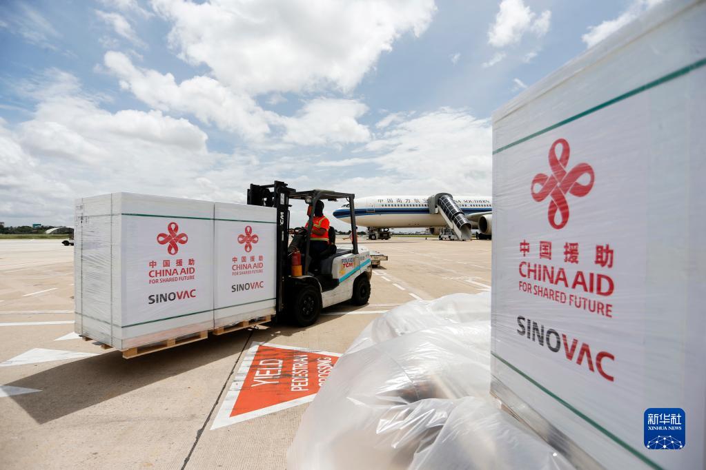 2021年10月14日,工作人員在柬埔寨金邊國(guó)際機(jī)場(chǎng)運(yùn)輸中國(guó)政府援助柬埔寨的科興新冠疫苗。新華社發(fā)(批隆攝)