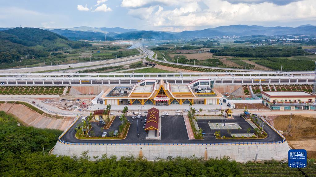 這是中老鐵路國內(nèi)段的玉(溪)磨(憨)鐵路野象谷車站一景(9月29日攝,無人機照片)。新華社記者 胡超 攝