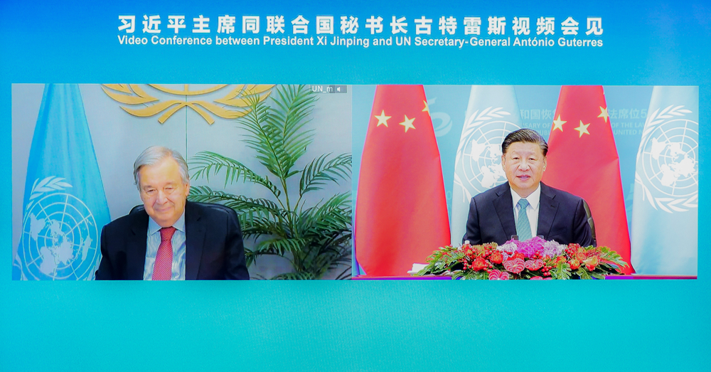 10月25日上午,國家主席習(xí)近平在北京人民大會堂以視頻方式會見聯(lián)合國秘書長古特雷斯。