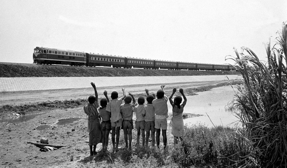 ↑1976年,贊比亞魯西瓦西湖畔的少年兒童歡迎坦贊鐵路的列車通到他們的家鄉(xiāng)。