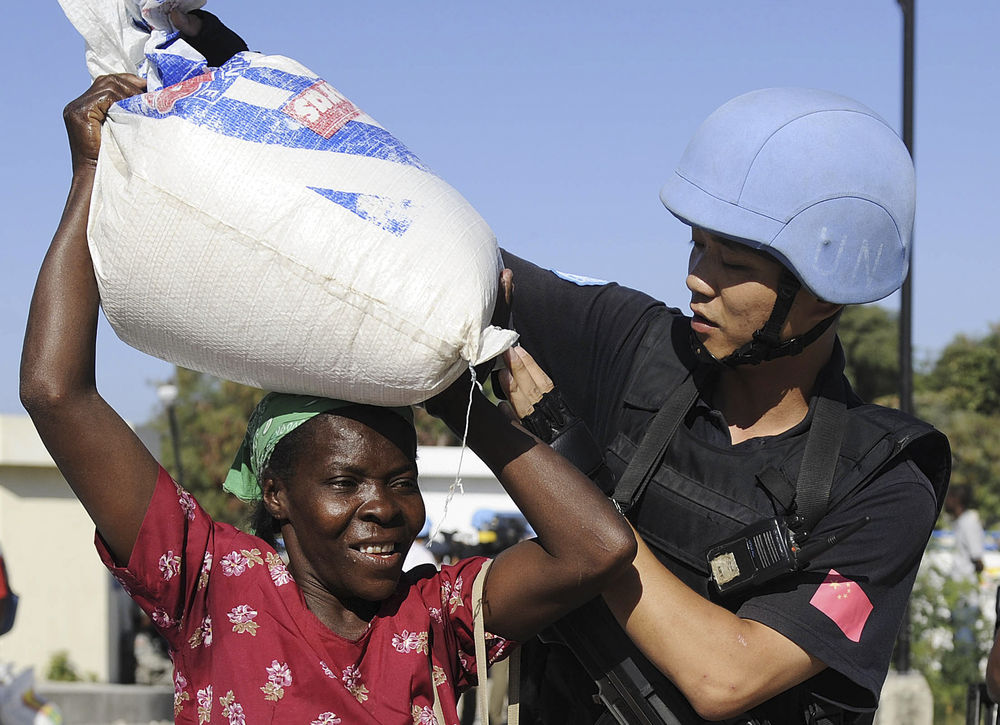 ↑2010年2月2日,在海地首都太子港,中國赴海地維和警察防暴隊隊員幫助地震受災(zāi)居民領(lǐng)取救濟糧食。