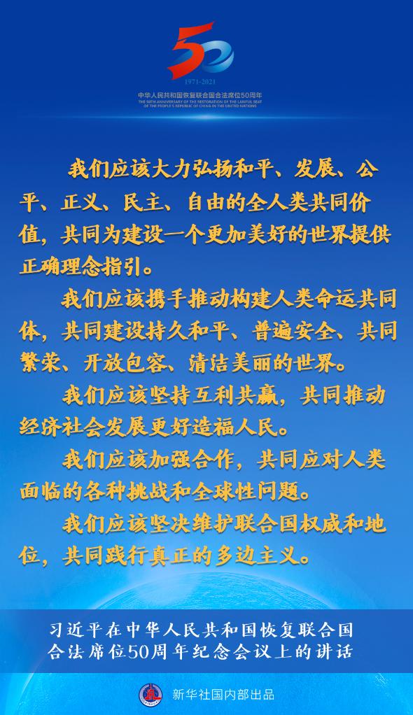 2021年10月25日,國家主席習(xí)近平在北京出席中華人民共和國恢復(fù)聯(lián)合國合法席位50周年紀念會議并發(fā)表重要講話。 新華社記者 李響 攝