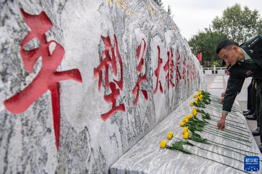 2020年9月25日,在位于山西省大同市靈丘縣的平型關(guān)大捷紀(jì)念館,工作人員向革命先烈獻花。