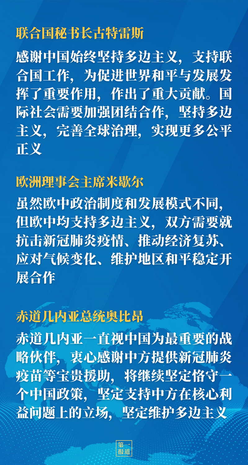 在同聯合國秘書長古特雷斯、歐洲理事會主席米歇爾、巴基斯坦總理伊姆蘭·汗、巴布亞新幾內亞總理馬拉佩、赤道幾內亞總統(tǒng)奧比昂等國際和地區(qū)組織以及國家領導人的交流中,習近平主席都分別同各方就堅持真正的多邊主義深入交流,獲得積極反饋——
