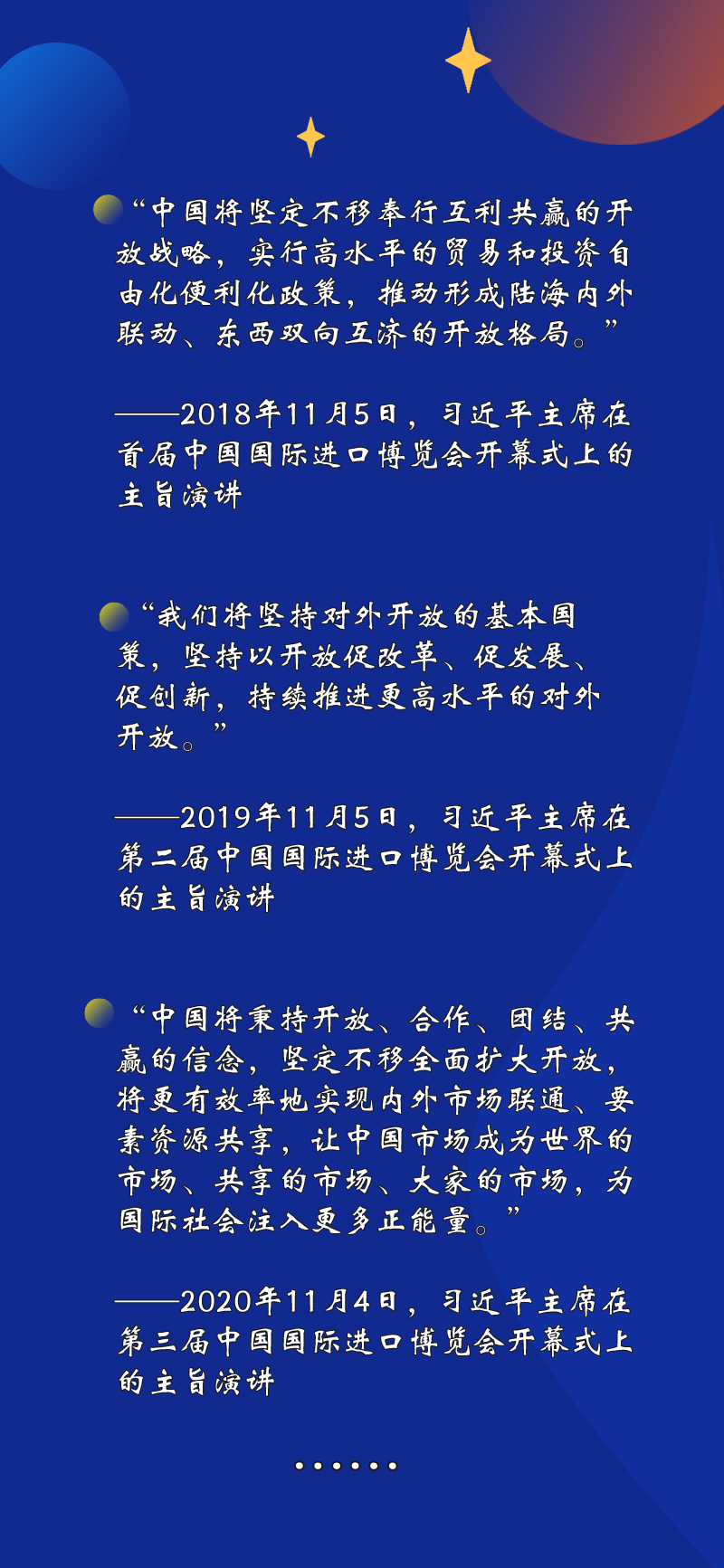 進(jìn)博會究竟有哪些特別之處?習(xí)近平主席對它為何如此重視?在過去三年的主旨演講中,習(xí)近平主席宣布了哪些重大舉措?提出了哪些重要倡議?一起來看——