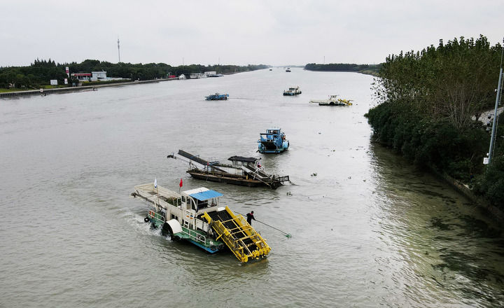 蘇浙滬三地的保潔船在位于長三角生態(tài)綠色一體化發(fā)展示范區(qū)的蘇浙滬交界水域太浦河流域聯(lián)合清理水面浮游植物(2020年10月15日攝,無人機照片)。新華社記者 方喆 攝
