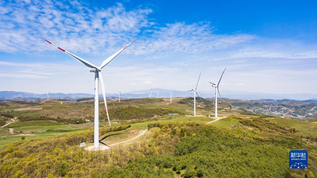 貴州省威寧彝族回族苗族自治縣雪山鎮(zhèn)的風力發(fā)電設(shè)備(2020年4月27日攝,無人機照片)。新華社記者 陶亮 攝
