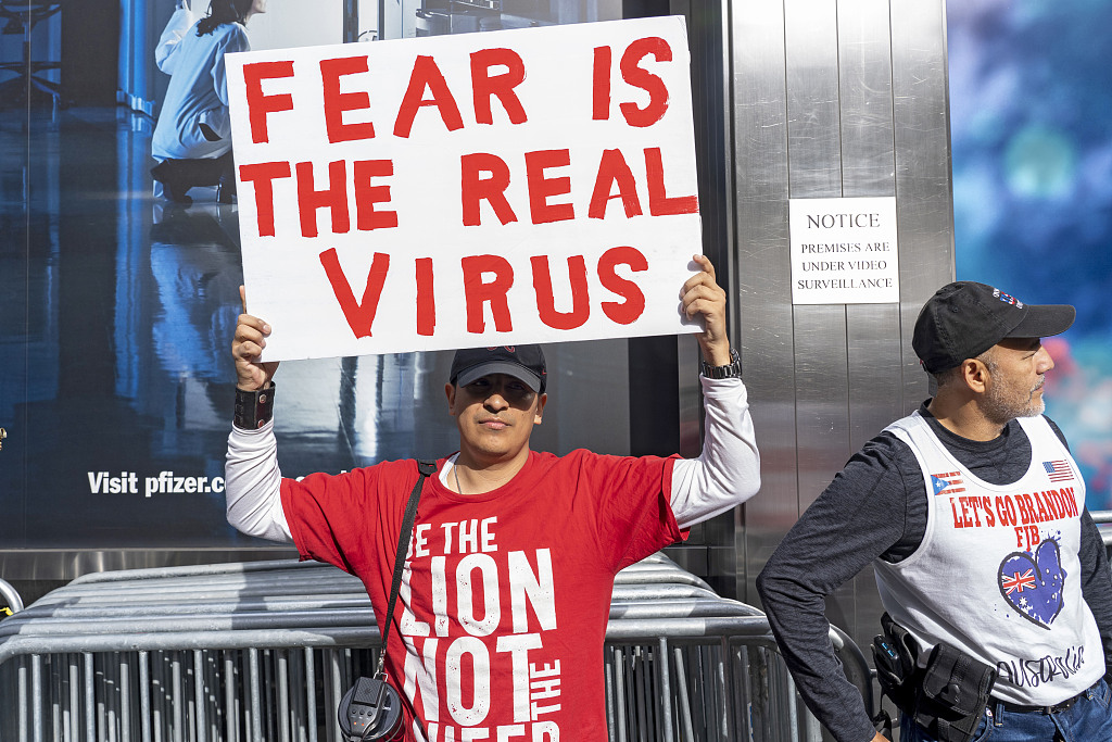 美國紐約曼哈頓舉行反對強制接種新冠疫苗的游行示威。(資料圖)