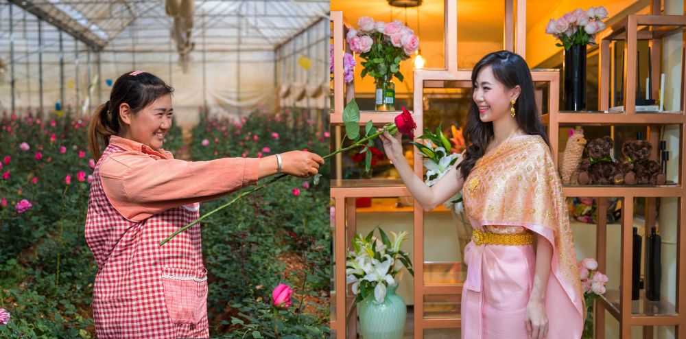 ↑2019年2月,泰國曼谷的一位女士(右)“接過”云南花農(nóng)“遞出”的一支鮮花(拼版照片)。