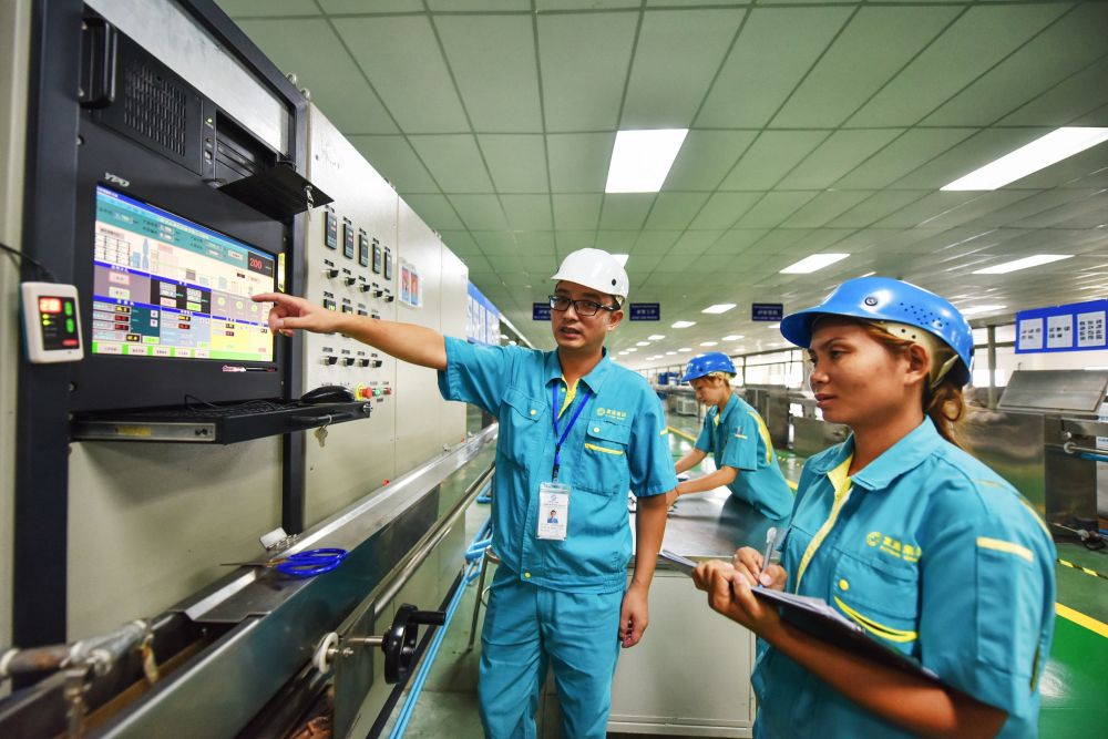 ↑2015年5月11日,在泰國羅勇的泰中羅勇工業(yè)園,中國技術(shù)人員(前左)對泰國工人進行技術(shù)指導(dǎo)。