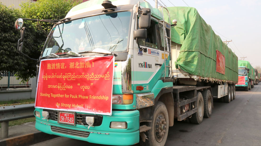 ↑2020年3月1日,為支援中國抗擊新冠肺炎疫情,緬甸向中國捐贈大米。