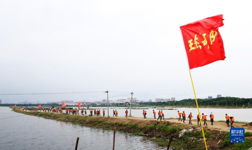 陸軍第71集團(tuán)軍某合成旅王杰生前所在連官兵跟隨部隊在江西共青城市共青聯(lián)圩共大圩段加固防洪堤壩(2020年7月19日攝)。新華社發(fā)(李志浩 攝)