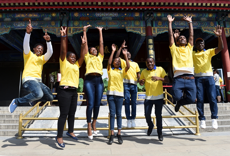 ↑ 2018年8月31日,來自非洲的圓明園志愿者在一起合影。成立于2017年的圓明園志愿者招募站長期面向公眾招募志愿者。2018年7月,近20名非洲留學(xué)生加入到圓明園志愿服務(wù)的隊伍中來,主要承擔(dān)講解、咨詢、引導(dǎo)等志愿服務(wù)工作。