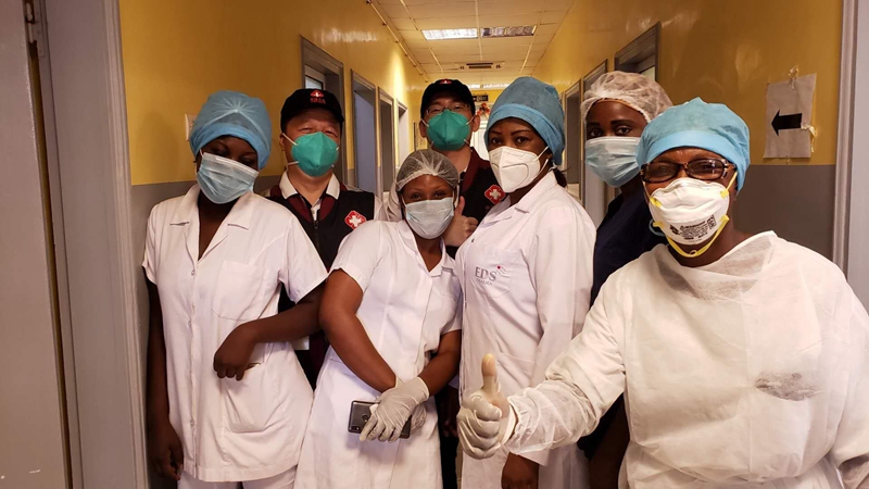 ↑ 2020年5月26日,中國抗疫醫(yī)療專家組在剛果(布)首都布拉柴維爾指導(dǎo)新冠肺炎病房建設(shè)時,與當(dāng)?shù)匾痪醫(yī)務(wù)人員合影。
