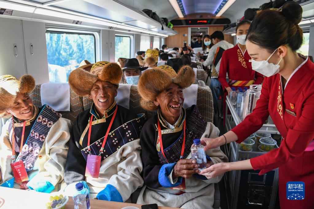 2021年6月25日,全長435公里、設計時速160公里的拉林鐵路建成通車,西藏首條電氣化鐵路建成,同時復興號實現(xiàn)對31個省區(qū)市全覆蓋。這是6月25日列車員向乘坐首趟復興號高原內(nèi)電雙源動車組的乘客遞水。新華社記者 普布扎西 攝