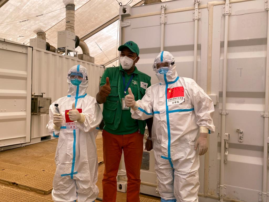 2020年9月2日,在幾內(nèi)亞首都科納克里一個核酸檢測取樣點,中國抗疫醫(yī)療專家組成員與當?shù)毓ぷ魅藛T合影。新華社發(fā)(專家組供圖)