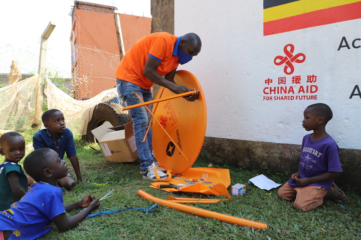 9月10日,技術人員在烏干達中部瓦基索區(qū)的布韋倫加村安裝調試數(shù)字電視設備。中國企業(yè)四達時代集團承建的“萬村通”項目讓這里的村民看上了畫面清晰而且免費的衛(wèi)星數(shù)字電視節(jié)目。新華社記者張改萍攝