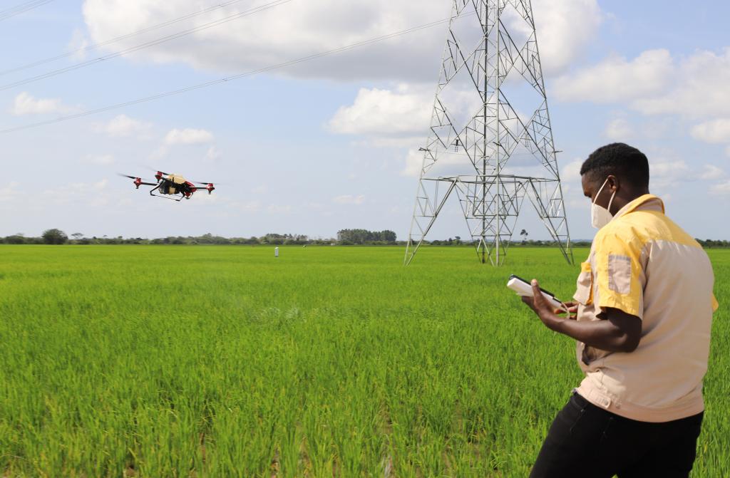 6月2日,在烏干達卡隆古區(qū)盧卡亞鎮(zhèn)中億農(nóng)業(yè)園,作業(yè)員赫伯特·阿加巴操控植保無人機噴灑農(nóng)藥。新華社記者張改萍攝