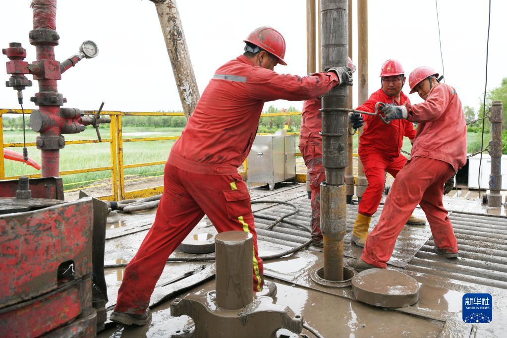 2019年6月27日,大慶油田1205鉆井隊隊長張晶(右二)與工人們在進行作業(yè)。新華社記者 王建威 攝