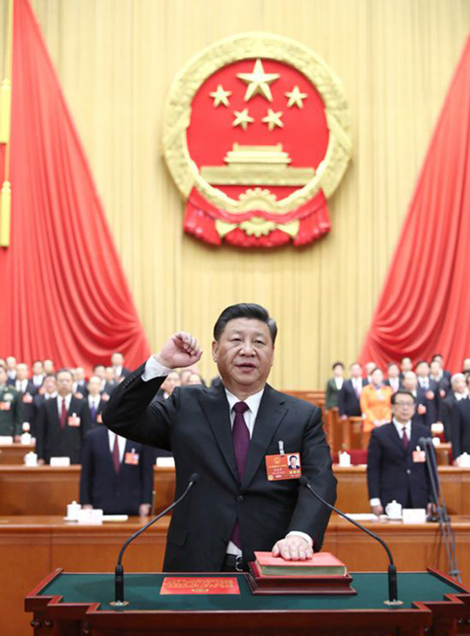 在十三屆全國人大一次會議第五次全體會議上,習(xí)近平左手撫按憲法,右手舉拳,面向近3000名代表宣讀誓詞。