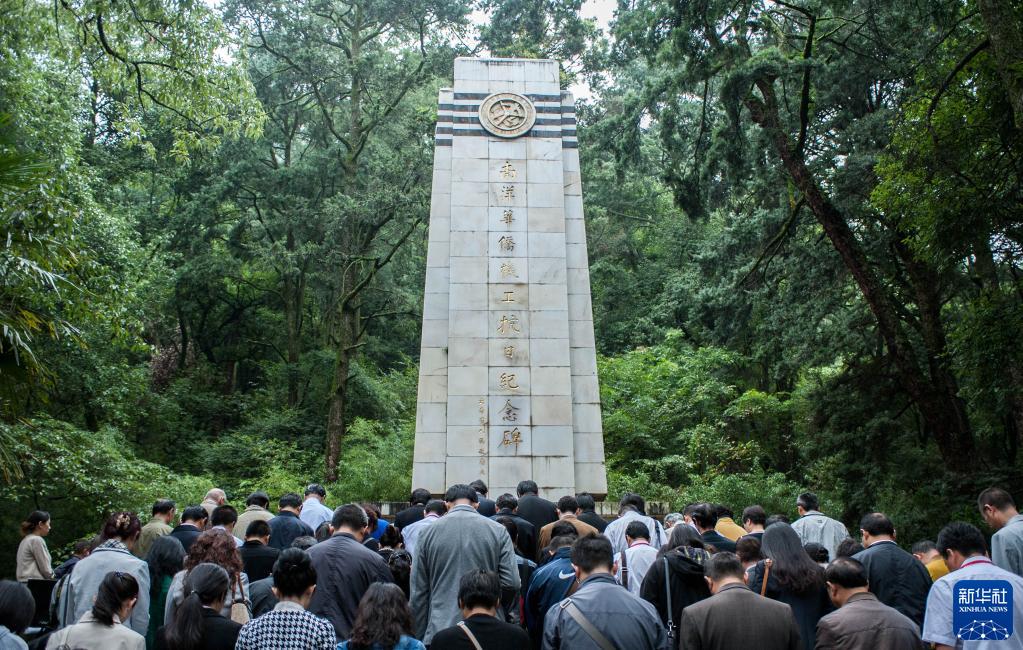 參加南洋華僑機(jī)工抗日紀(jì)念碑瞻仰活動(dòng)的全體人員在云南省昆明市西山森林公園的南洋華僑機(jī)工抗日紀(jì)念碑前默哀(2015年9月8日攝)。新華社記者 呂帥 攝