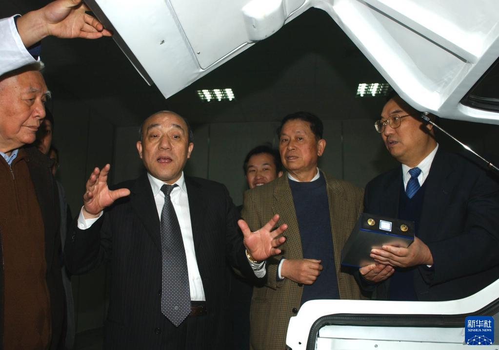 魯冠球(左二)向參觀者介紹萬向集團(tuán)研發(fā)電動(dòng)汽車的情況(資料照片)。新華社發(fā)